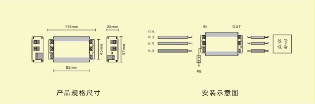 用于220V电源与两组12V信号设备防雷 |
